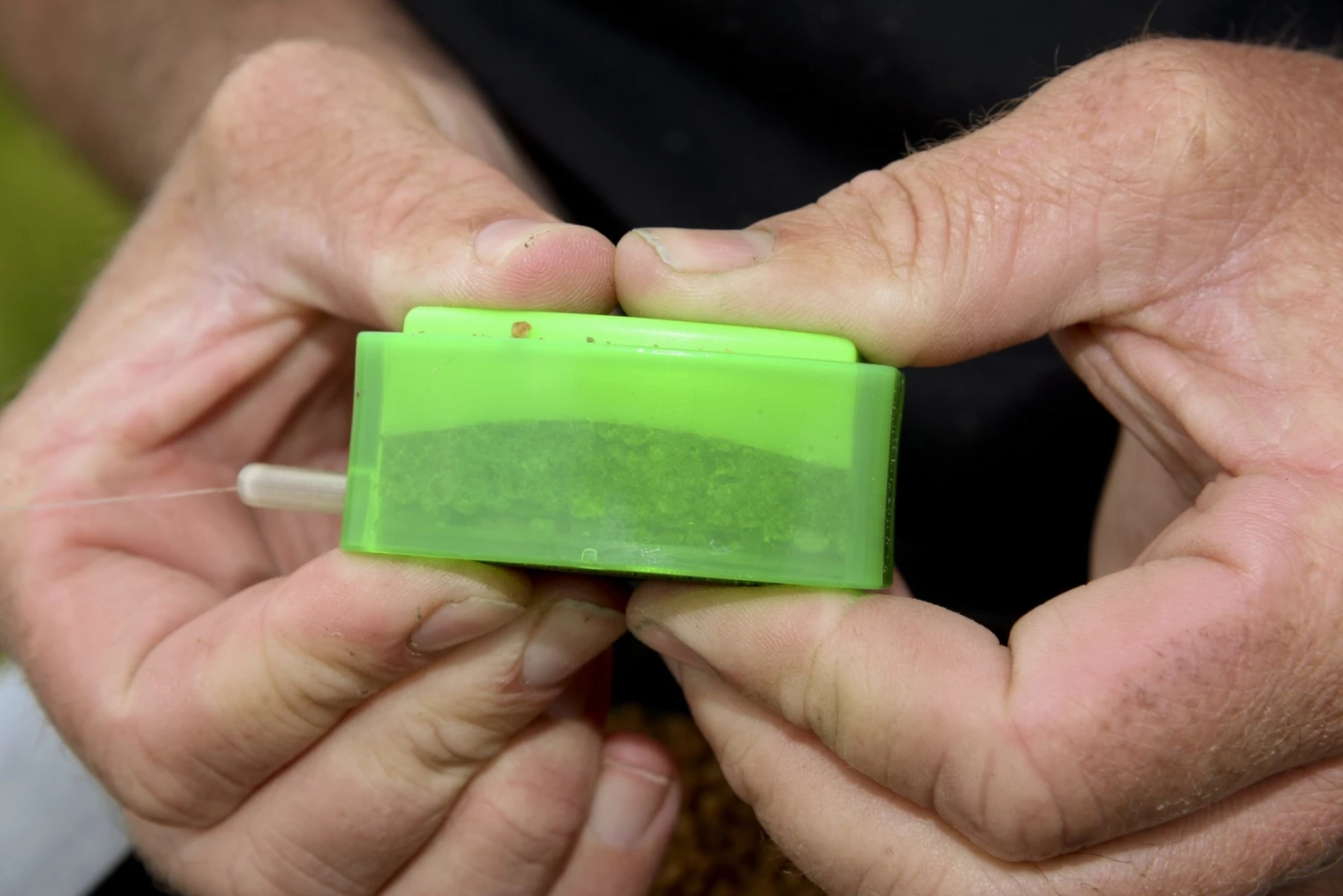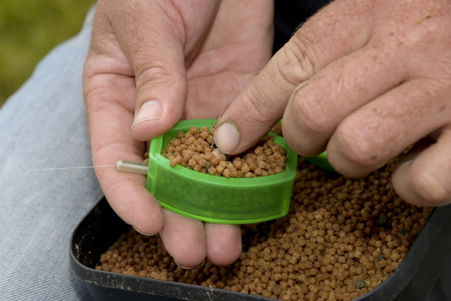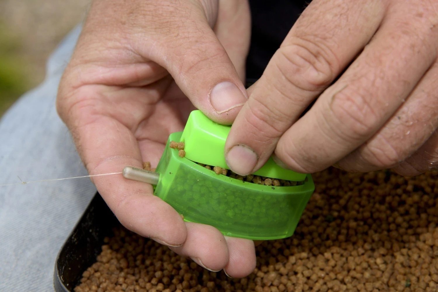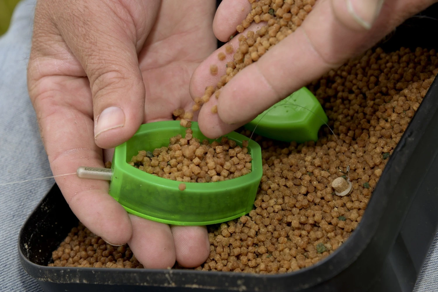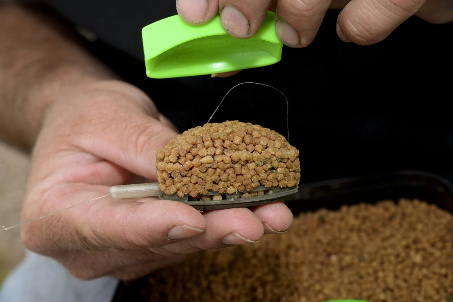 Deze inhouse ontworpen method mould maakt het vullen van een method feeder korf zeer eenvoudig. Plaats de ring over de feeder en vul deze vervolgens af met voer. Met behulp van de stempel kan nu het voer vast op de feeder gedrukt worden.